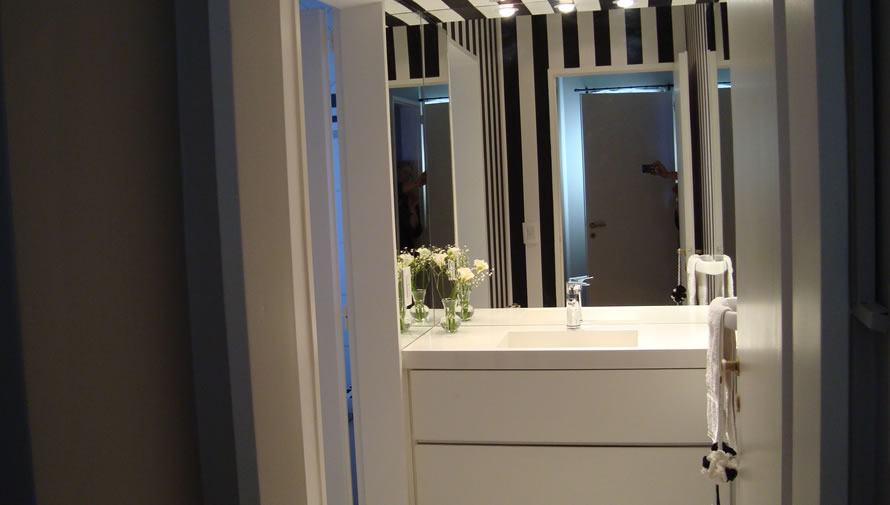 Materiales: silestone. Espejo. Revestimiento papel. Cemento alisado.